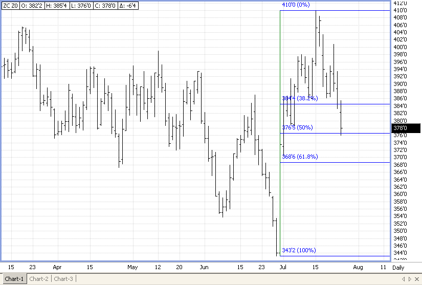 First off, the ZC Corn. This chart shows that we have seen a 50 percent correction of the 66 cent rally. Today’s low took out the 50% retracement at 376 5/8. Next support is at 368 3/4. Take advantage of this down move to cover shorts. Depending on how much of a turn-around-Tuesday bounce we get, it also is a good place to go for a bullish ten to 15 cent bounce. A failure to bounce is a good indication that the market will be looking to punish the weak longs who jumped on the corn rally too late and are now long from the 4.00 to 4.10 window. In an attempt to buy the break-out and go with a momentum trade, these weak longs are now going to have their intestinal fortitude, or more importantly their trading discipline tested. Will they add to their losers? Will they average down, or will they blow out when their stops are hit. No one knows.
