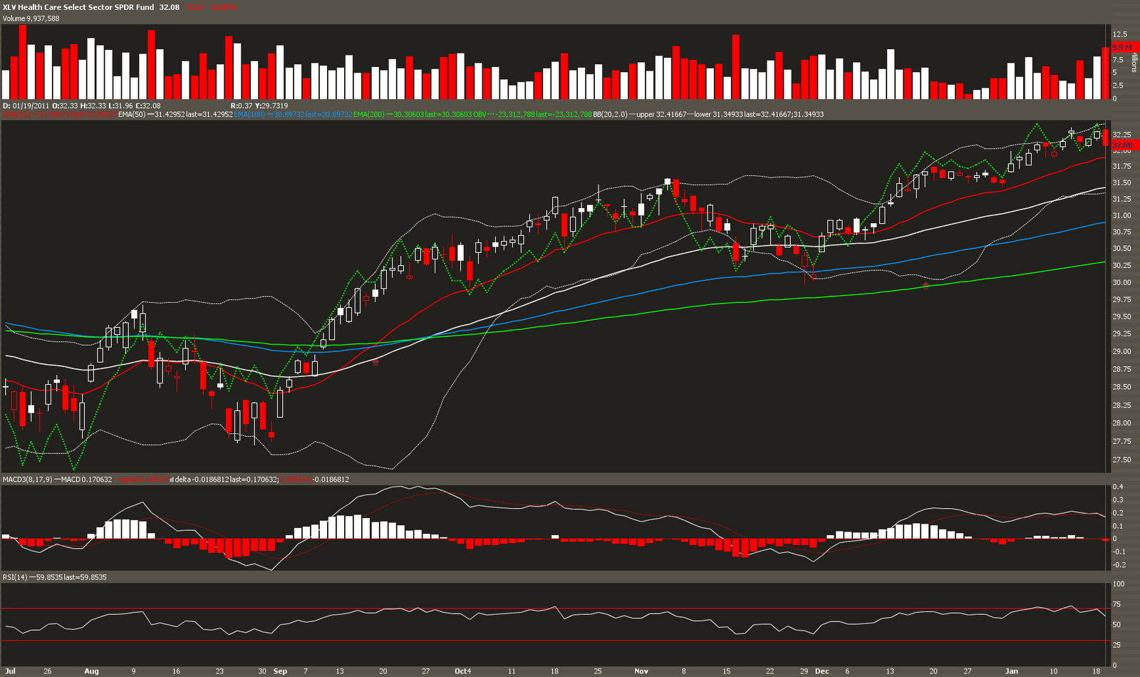I would also plan on purchasing shorter tem puts on this ETF, because this is sector specific and would think based on the ugly price action and recent overbought levels, it is due to correct sooner rather than later. I am structuring my bet on this ETF a bit differently than the last few. As you can see from the chart of the XLE above, the stock left a couple of gaps on the way up, and I believe those have a high probability of being filled if we get a pull back. I would purchase puts below the 20 day moving average at minor support near 68, and I would sell puts near 60. Therefore I would put on a February 68/60 put spread. This would cost me roughly $75 per spread. This strategy is a bit more bearish and factors in quite a significant correction, but selling the 60 puts versus the 61 or 62 puts didn’t make too much of a difference compared to potential returns, especially because that lower gap which would need to be filled around 59.94. If this ETF sold off and closed at or below 60 on February options expiration this strategy would return $800 per spread or 1,067%.