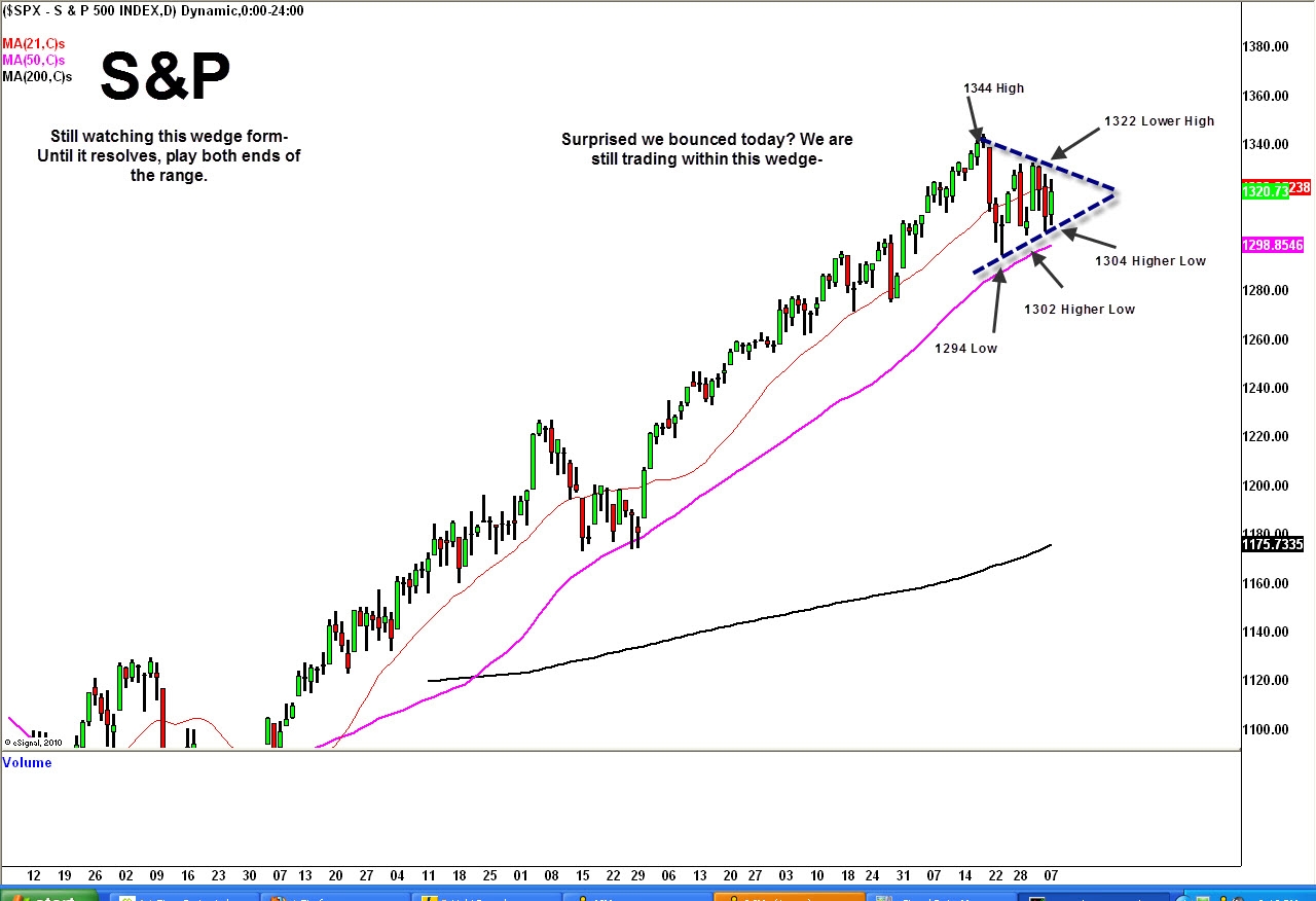 March 8 we bounced again off the lower trendline of the wedge, making it even more defined. Today we are seeing further tightening of the pattern, as investors gauge whether they can confidently buy at these levels with continued unrest in the Middle East and rising oil prices weighing on the recovery. We will not make any sort of guess on the direction the pattern will be resolved, but will let the price action point tell us the next big move.