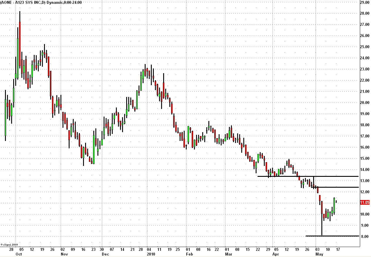 Here are some highlights on a couple of trade ideas that are important to keep in mind over the coming days. Last week we saw the break in SPY of the wedge pattern to the downside, that was indicated by Scott Redler. Due to the fact we are in a correction-type environment I believe all the trade ideas should be relatively short term and be adjusted to the fact that stock market might become volatile again, with the VIX staying above 30 level. Although I think that SPY will continue its downside action, my trade idea for this week will be A123 Systems, Inc. (AONE) long for very short term trade (day or two).