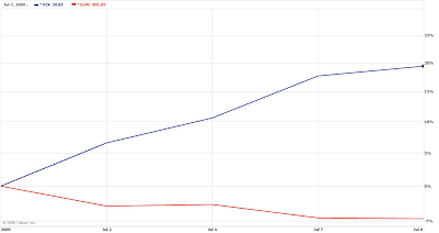 I believe the market may be due for a short term sell off as earnings season comes to an end, so one way to hedge your overall portfolio (as well / instead of selling covered calls on stocks like mentioned in Sell Off Ahead? 25 Ways to Profit & Protect from a Stock Market Correction) is to trade options on the VIX. I believe the VIX at 30-35 isn’t out of the question, as we all know the U.S. economy just isn’t out of the woods yet. If increased levels of uncertainty return back to the market in Q3 or Q4, I expect to see the VIX at 35 or higher. A one week chart of the VIX and S&P, from the early July sell off, is below.