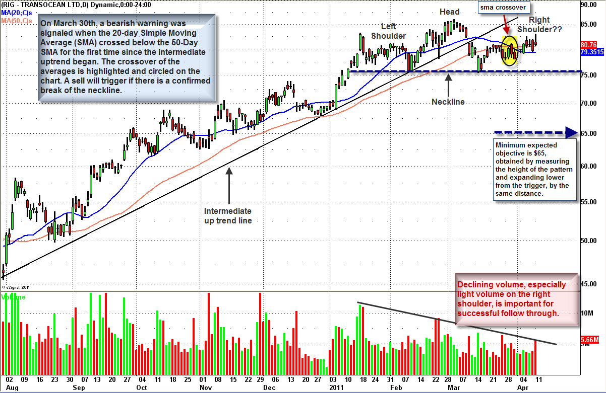 Chart 1: In March the rising trend line was broken, ending the intermediate uptrend in RIG. On March 30th, a bearish warning was signaled when the 20-day Simple Moving Average (SMA) crossed below the 50-Day SMA for the first time since the intermediate uptrend began. A potential bearish head and shoulders pattern is forming, which will trigger with a confirmed break of the neckline. Trigger: confirmed break of the neckline, at $75.50. Target: minimum expected price objective is 65 dollars, measured by the height of the pattern. Protective Stops: may trigger on a confirmed move back above the neckline.