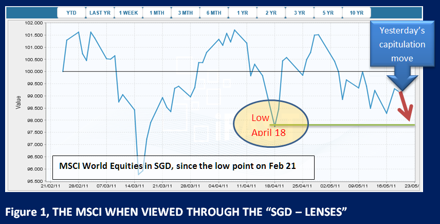 The reason I am showing you the MSCI World in SGD terms (instead of a DJIA or S&P500) is to alert you on exactly where you – the SGD investor – are positioned. Avoid being bamboozled by an index chart in any other currency! We are only back to the levels of April 18 and, to all intents and purposes, it looks as though markets could find support here. The rout, to me, only confirms that weak hands have been shaken off by the recent volatility and it is the strong hands that are poised to regain the upper hand: it means that a short sharp rally in equities is on the cards, even if it does not last very long!