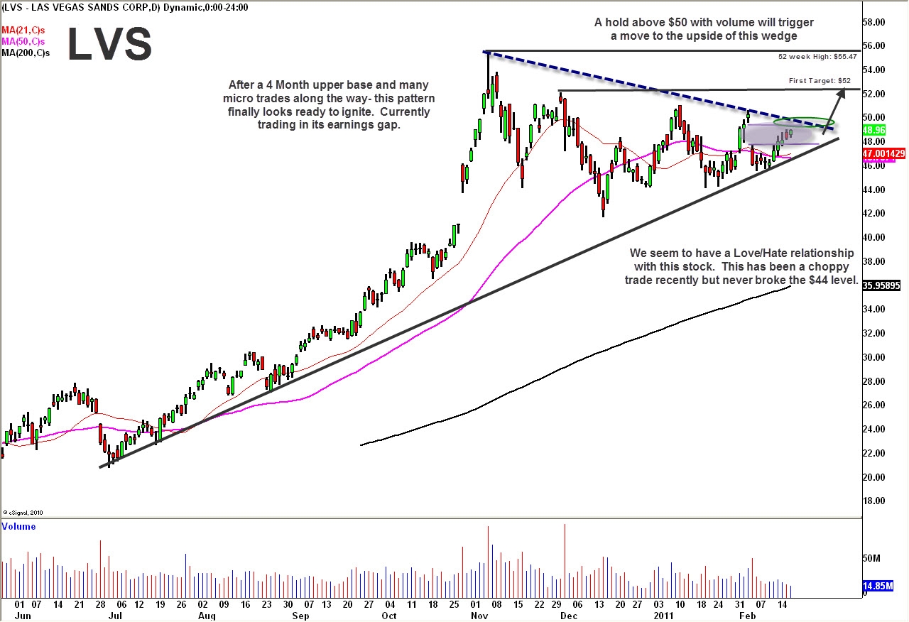 As technical traders we always love long-term consolidation patterns that provide defined risk-reward for a trade. Las Vegas Sands Corp. (LVS) has been one of the strongest stocks since March 2009 lows, surging from less than $2 to the $50s. Over the last few months, however, the stock has formed a drawn out wedge pattern in its upper range. That range was getting tighter into earnings, and we were excited about a potential move.