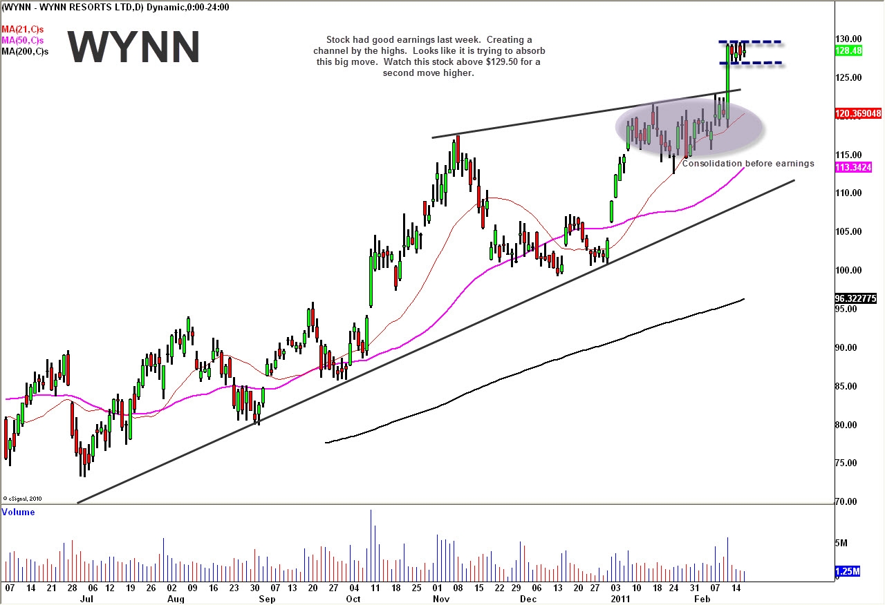 Wynn is the clear-cut leader in the group, which was further evidenced by its stellar Q4 2010 earnings report. The company has great exposure to Macau, where revenues continue to explode from VIP and mainstream gamblers. The stock jumped sharply a week ago following the company’s earnings, and since then has consolidated in a very tight range in the upper end of that igniting bar. Watch this stock about $129.50 for another move, which seems inevitable. In addition, there are plenty of analyst price targets in the $140 range, which is also the destination of the measured technical move.