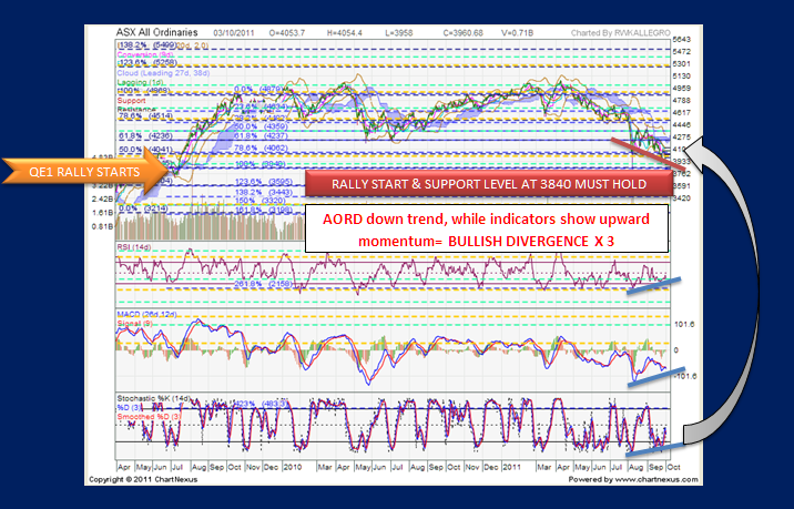 It is a crowded chart and you might be tempted to ignore it, but bear with me and look at the chart a little more closely: there is a distinct message the markets appear to convey. In a previous blog, I already said that according to markets, QE2 was a whitewash, as at the end of it, valuations came back down to the same levels it started in August 2010. Since then markets have moved ‘on’ – down – to levels where they even nullify any positive effects of QE1. (see orange arrow: start of the QE1 rally in 2009). Along the same level you see the red bar, which tells you that this is the major support level that must not be broken, for if it does, markets could turn down in a much nastier fashion. Last months’ price structure in the AORD shows almost the capitulation of equity investors on the one side, while the underlying momentum indicators show a turnaround in fortunes by trending upward over the last few weeks! That is what makes a bullish divergence x 3.