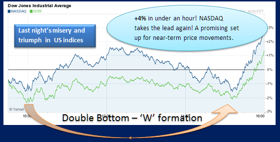 (Last night..) 15:00h Wall Street time must have been the DARKEST HOUR in the midst of panic and screams to run for cover. Financial markets had been falling unnervingly for only 3 days, yet sentiment was as disastrous as it was in midst of the chaos of 2008. Telling anyone to stop fretting fell mostly on deaf ears: “He’s nuts, he’s lost it now!” Those who threw away their assets with no regard to their value will have reason to regret shortly, unless you still have the gumption to do a mental turnaround as swiftly as US equity market traders did.