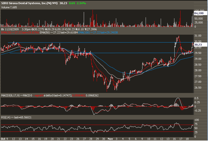 The list above contains many stocks which I have seen appear multiple times while screening for these stocks. This list is also packed full of stocks I have been keeping an eye on and would like to own as I think they will trade higher. Out of the stocks listed above, I will write about Sirona Dental Systems (SIRO). With the help of the market, I believe this stock will continue to outperform. I believe it will be worth describing a detailed option play I am interested in below. Note that many of the stocks listed above will be good plays and many will be bad plays, I list them all to show possible breakout stocks and write about a few of the ones I am interested in. (Click chart to enlarge).