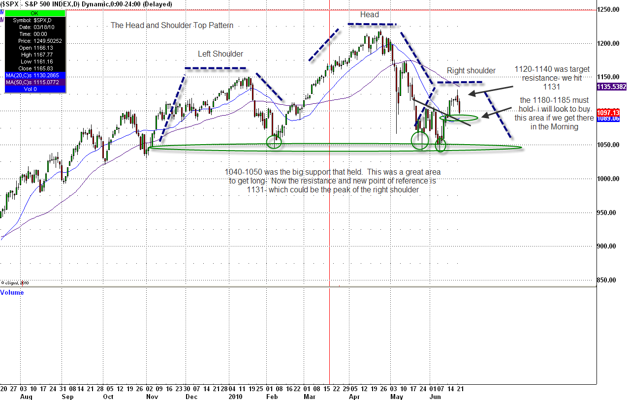 Sometimes it’s hard to look ahead but you always need to have a plan. We tried to outline the potential head and shoulders pattern before it developed on June 3rd. The potential “right shoulder” was at first 1120-1140 as you can see by the chart from June 3rd. Then as time evolved I was thinking 1130-1150. Bottom line, as hard as it is to paint the picture, it’s also hard to act on your plan as the market confirms it.
