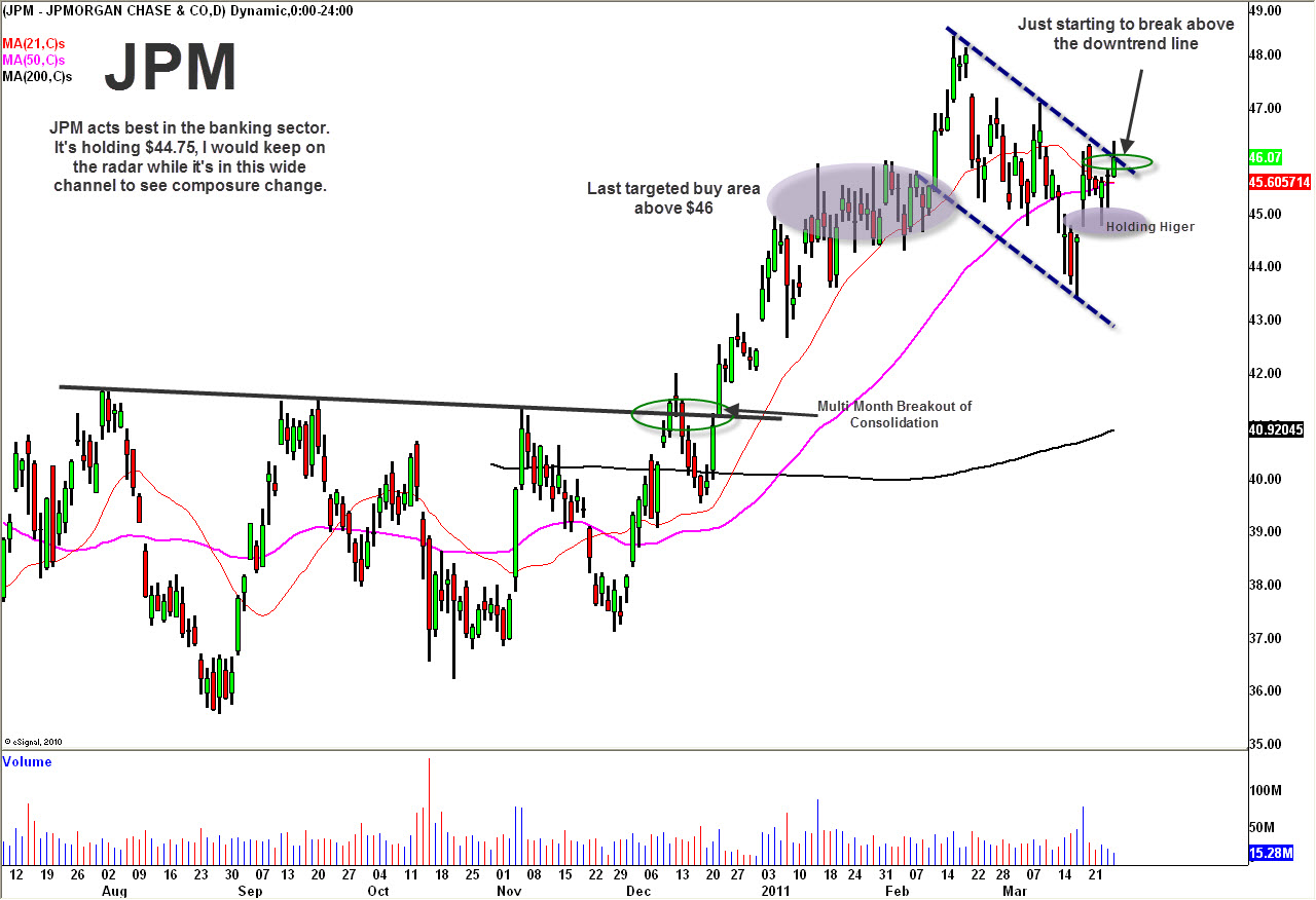 When a market begins to bounce after a correction, the first stocks and sector to go are the ones that held up the best. Up to this point we have looked, for the most part, for stocks that held above key levels and moving averages. However, as a rally gets back more in full swing, you can start taking a look at more laggard type plays for good potential momentum. The banking sector fits the bill of a laggard. When playing a lagging sector, you always want to play the strongest stock in the group, and right now that is JP Morgan Chase & Co. (JPM). JPM is back above its moving averages and holding up well, so we expect it to be back to 52-week highs above $48.