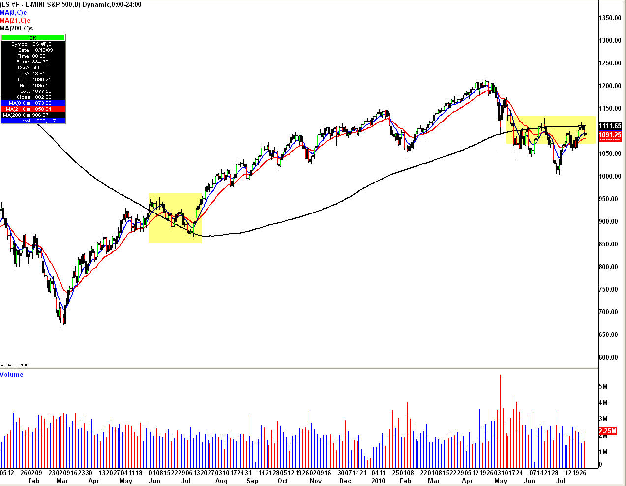 After the March 2009 lows were put in and the market snapped back and recaptured the 200 day MA you could clearly see the market begin to consolidate and hold above this moving average which acted as a clear level of support until the market began its next multi-month rally higher. We are now at an interesting point in time as the markets have reversed course and the exact opposite is occurring. Astute traders should continue to watch the recent price action as the futures continue to consolidate under the 200 day.
