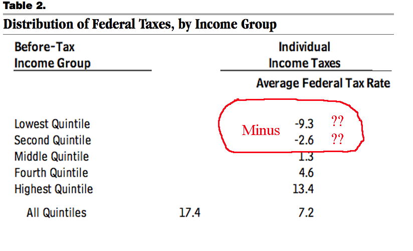 – The negative tax rates for the bottom 40% (minus 9.3% for the lowest quintile, and minus 2.6% for the second lowest quintile) includes payments of Social Security, Medicare/Medicaid and other government transfers.