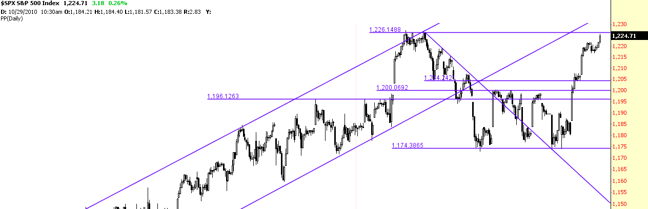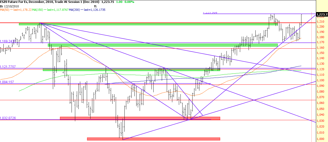 The futures market shows the nice bounce off of support to reclaim the upward trendline. As we can see the uptrend was quickly met with a past resistance of 1225. This is the same resistance that killed our two month rally. If the bulls cannot take over this resistance it will be putting in a classic double top which will see another sell off.Â