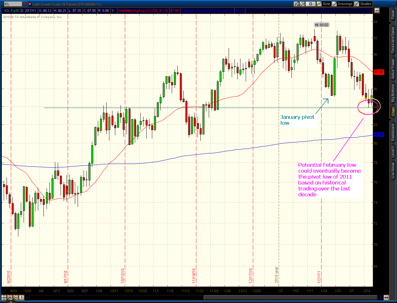 Earlier it was mentioned that WTI crude traded higher between mid February and early June in eight of the last 10 years. In six of those eight occurrences, during the month of February, WTI crude either retested or traded below January’s pivot low, before finally making it’s move higher, never looking back. Marc Sperling calls this type of price action ‘shaking the tree’ to get the weak longs out… when referring to WTI crude, I call it the West Texas Two-Step.