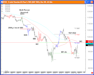 The problem near term for the SP500 is that after its two-day 27% rally on Oct 14 08, the crash resumed. Like the Dow in 1929, it paused today after plunging 3% below the Oct 10 08 daily low close and bounced admirably. If the bounce is only one day, and unsustainable and closes poorly on Friday, that would be a signal that keeps us on the 1929 crash map. This would not not portend well for the onset of next week. But the key here is to listen to the tape and trade what you see. And what I see is that the market supported the daily low close, hence the tape today is telling us that the bad news may be priced in now with all trading above the daily low close at 891.