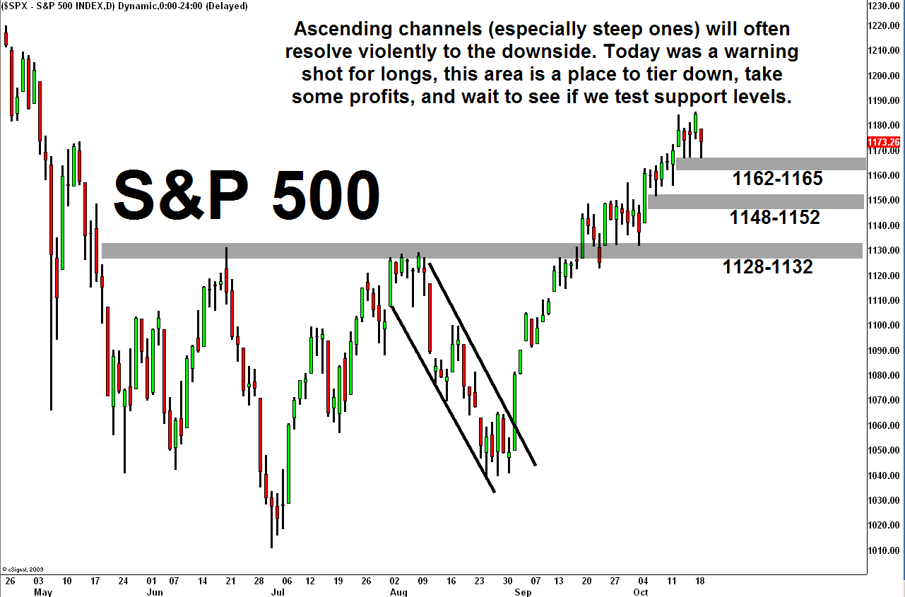 In this market, every four to six weeks we have a day to take notice (although the damage could have been much worse). Today was the first day in more than a month and a half that we did not hold very shallow support. We broke the accelerated uptrend, which should give us a move to at least 1148-1152 in the S&P. A further retracement down to the 1128-1132 level would provide an even greater buying opportunity.