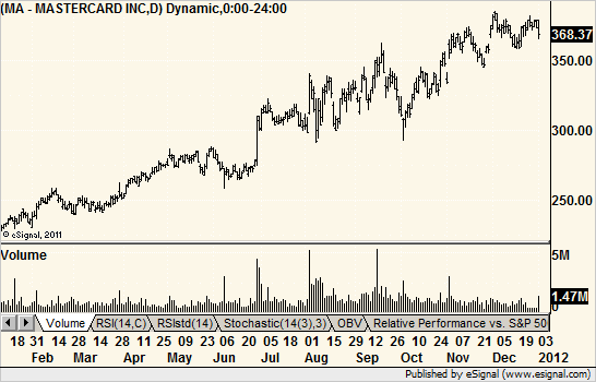 In this morning’s Quick Takes Pro newsletter, I wrote up a few of last year’s leaders that actually fell significantly on a day when the Dow came roaring out of the gate (mixed metaphor – horses do not roar – but you get the point). Here is one of them – MasterCard.